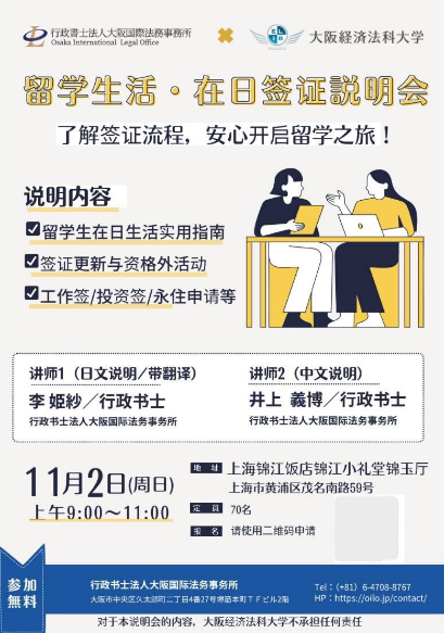 以前,同大学キャンパスにて留学生向けにお話しした内容や在留資格,将来的な永住,日本(特に大阪)の最近の状況などについて当社の行政書士がお話しさせていただく予定です。